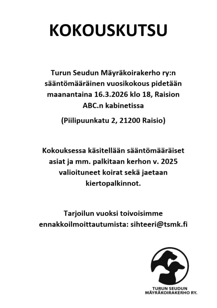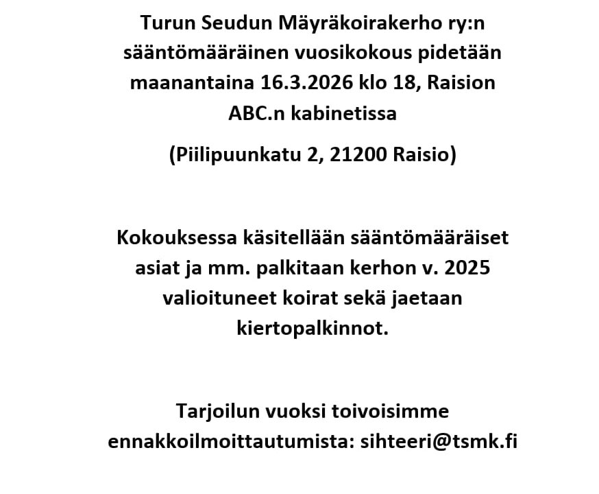 Vuosikokous 16.3.2026, Raision ABC, tarjoilun varmistamiseksi ennakkoilmoittautuminen: sihteeri@tsmk.fi Jäsenkirje saapuu maaliskuun alussa, jonka liitteenä lähtee myös kaikille kokouskutsut. Nyt onkin hyvä aika tarkistaa, että jäsenmaksu on […]